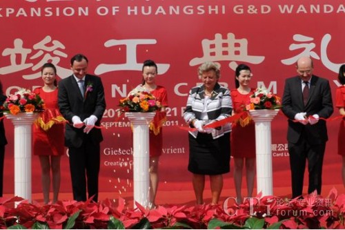 2011年9月21日, 湖北黃石。 黃石捷德萬達(dá)金卡有限公司在湖北黃石的工廠舉辦竣工典禮,慶祝公司第四期廠房擴(kuò)建項目順利竣工并投入使用。