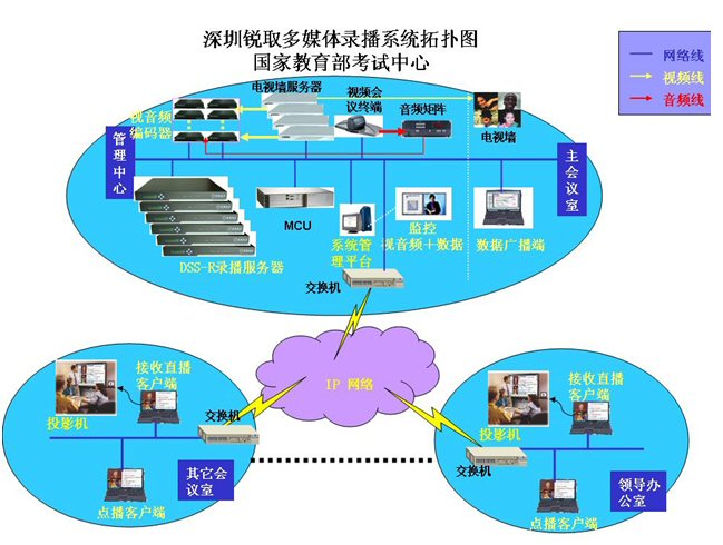 國家教育部考試中心為了對高考等大型考試實(shí)時(shí)性指導(dǎo)、監(jiān)考、培訓(xùn)等,特建立了視頻會(huì)議系統(tǒng)、監(jiān)考系統(tǒng)。為了使整個(gè)系統(tǒng)更完善、應(yīng)用價(jià)值更高,因此在此基礎(chǔ)上配置了銳取多媒體錄播系統(tǒng)。不僅實(shí)現(xiàn)了與各地考試中心及考點(diǎn)的圖像、語音和數(shù)據(jù)的交互通訊,還可以輔助系統(tǒng)完成視頻會(huì)議、監(jiān)考系統(tǒng)及培訓(xùn)的錄制、直播和點(diǎn)播功能,錄制、直播和點(diǎn)播的內(nèi)容包括了所有考試中心、考點(diǎn)圖像以及聲音和數(shù)據(jù)信號(hào)。