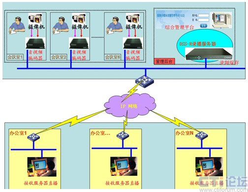 基于上述的需求,經過調研選用深圳銳取錄播服務器產品完成上述的功能需求。如圖所示,通過放置在每個會議室考場內的攝像機,將竟聘者的圖像與聲音傳輸到相連接的銳取公司的視音頻編碼器上,通過編碼器的編碼將采集的信號(通過內部網絡)傳輸到后臺的管理平臺上的DSS-R錄播服務器中。服務器的直播模塊將從音視頻編碼器接收到的信號分發(fā)到網絡中,每個接入內網絡的辦公室內里的電腦通過專有客戶端接收考場實時內容,實現了真正意義上的接受機關廣大干部群眾的監(jiān)督考察。同時錄播服務器內置的錄制模塊,將收到的信號內容解碼錄制保存(服務器內有可供存儲的硬盤),為日后干部的選擇做到了有理可依,有據可查。