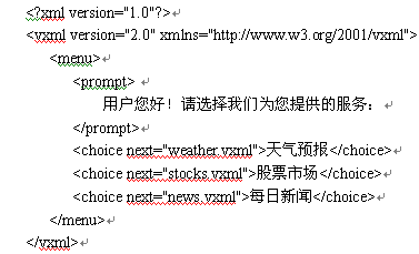 目前人們對HTML已經很熟悉,類似于用于Web網(wǎng)頁標記的HTML,VoiceXML是為語音應用制訂的語音可擴展標記語言。VoiceXML使公用電話網(wǎng)與互聯(lián)網(wǎng)的結合體現(xiàn)在三個方面:語音瀏覽器的使用,互聯(lián)網(wǎng)和公用電話網(wǎng)的信息共享,以及類似于Web網(wǎng)頁開發(fā)過程的語音應用系統(tǒng)的開發(fā)。