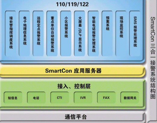 110/119/122等系統(tǒng)和一般企業(yè)的客服系統(tǒng)和熱線系統(tǒng)有一定的共性,但它們肩負(fù)著保障社會(huì)安定和人民生命財(cái)產(chǎn)安全的重任,這些決定了該系統(tǒng)的特殊性,使它有別于其他行業(yè)的應(yīng)用。我們公司依托雄厚的技術(shù)開發(fā)力量,結(jié)合多年來在公安/消防/交通領(lǐng)域豐富的系統(tǒng)研發(fā)實(shí)施經(jīng)驗(yàn)積累,面向未來的發(fā)展,提出了以SmartCon呼叫中心平臺(tái)為核心的三體合一的、綜合的整體解決方案。該解決方案充分考慮到公安/消防/交通系統(tǒng)的現(xiàn)在和未來的發(fā)展趨勢(shì),110/119/122三個(gè)系統(tǒng)既可分開單獨(dú)處理報(bào)警事務(wù),也可整體考慮、整體調(diào)度。該解決方案涵蓋了電話報(bào)警、SMS報(bào)警、接處警指揮調(diào)度、電子地理信息系統(tǒng)(GIS)、現(xiàn)場(chǎng)監(jiān)視以及小區(qū)報(bào)警雄等等,各個(gè)子系統(tǒng)之間相對(duì)獨(dú)立,用戶可以根據(jù)實(shí)際要求,進(jìn)行自由搭配,充分體現(xiàn)了系統(tǒng)的靈活性。