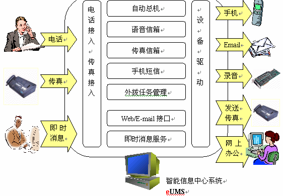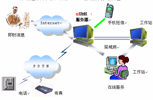 整個系統(tǒng)以eUMS服務器為核心,對內(nèi)連接企業(yè)局域網(wǎng),對外連接互聯(lián)網(wǎng)。eUMS內(nèi)配置一塊語音/傳真卡,負責電話、傳真的接入。如果企業(yè)需要自己的短信服務,也可以在eUMS服務器上安裝手機短信網(wǎng)關,外接一部手機即可。