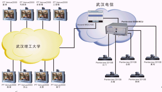 武漢理工大學的遠程教學系統(tǒng)由于分3期建設,網(wǎng)絡條件較為復雜。一期主要以PT的Venue2000終端+Accord MGC100 MCU為主,是一個H323系統(tǒng);二、三期采用中太多媒體的Penteview2010終端+Penteview6088MCU,是一個H320系統(tǒng),兩套系統(tǒng)通過網(wǎng)關無縫結合到一起工作,用戶根本感覺不到不同。各教室均同時采用了中太多媒體的遠程教學支撐系統(tǒng),通過對Penteview會議電視系統(tǒng)的擴充,實現(xiàn)了以下功能,使教學應用更加方便: