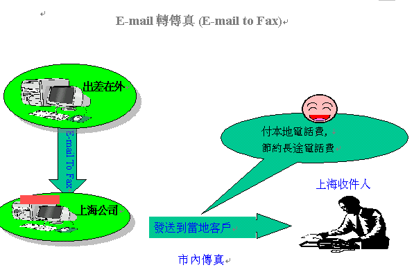特別值得一提的是,E-mail轉(zhuǎn)傳真功能還能節(jié)省很多長途電話費,如李先生出差在香港,需要將傳真發(fā)回公司所在地上海的客戶,通過E-mail將傳真發(fā)送到上海公司的伺服器,伺服器再將傳真發(fā)送到李先生上海的客戶處,如此一來,國際長途傳真只收市話費,何樂而不為呢?!