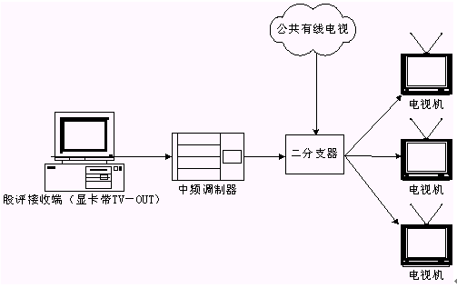本系統(tǒng)接收端接收實(shí)時(shí)廣播時(shí),除了用普通PC機(jī)收看,或把PC機(jī)接收到的信號輸?shù)诫娨暎ù笃粒┥鲜湛矗踔吝可以接入有線電視網(wǎng)進(jìn)行播放。具體方法是通過一個(gè)接收端接收股評節(jié)目,通過帶TV-OUT的顯卡把TV信號輸出到中頻調(diào)制設(shè)備,中頻調(diào)制設(shè)備可以把基帶模擬信號轉(zhuǎn)換成一個(gè)有線電視信號,且傳輸距離遠(yuǎn),損失小,再把這個(gè)信號與有線電視信號一起接入一個(gè)二分支器(2進(jìn)1出),這就可以和公共有線電視共存,形成自己的頻道,供電視接收。