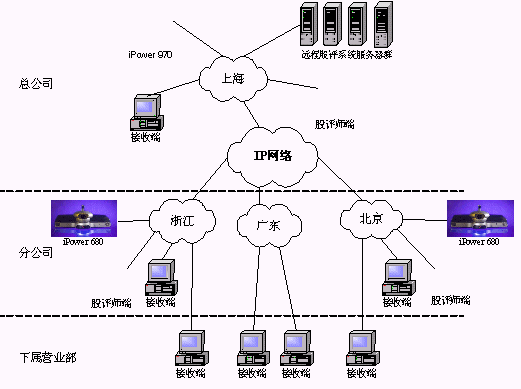 某證券公司有三級網(wǎng)絡(luò),總公司、分公司和下屬營業(yè)部。總公司到分公司帶寬是2M,在總公司配置一套會議室型電視會議終端POLYCOM 970和一套多點(diǎn)會議服務(wù)器Radvision ViaIP400。在分公司配置了38套會議室型電視會議終端POLYCOM 680,用于與總公司進(jìn)行雙向視頻會議。分公司到營業(yè)部帶寬是512K,各營業(yè)部安裝遠(yuǎn)程股評系統(tǒng)接收端程序,遠(yuǎn)程股評系統(tǒng)服務(wù)器都放置在海通總公司。當(dāng)在總公司進(jìn)行股評時(shí),總公司本地?cái)z像頭拍攝教師畫面,MIC采集教師聲音,傳給服務(wù)器編碼,再通過網(wǎng)絡(luò)供各個(gè)接收端接收;當(dāng)在分公司進(jìn)行股評時(shí),首先分公司的電視會議設(shè)備采集教師畫面及聲音傳回總公司的電視會議設(shè)備,再傳給遠(yuǎn)程股評系統(tǒng)的服務(wù)器進(jìn)行編碼,然后通過網(wǎng)絡(luò)發(fā)布,供接收端接收。(結(jié)構(gòu)如下圖)