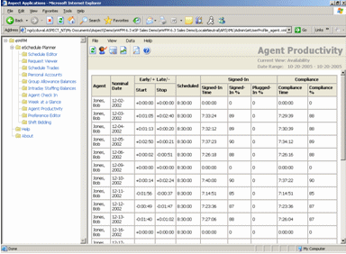績(jī)效模塊的歷史數(shù)據(jù)功能可以幫助您發(fā)現(xiàn)勞動(dòng)生產(chǎn)率最高和最低的坐席員和坐席組。通過這個(gè)工具,您可以建立勞動(dòng)績(jī)效的參考標(biāo)準(zhǔn),并建立坐席個(gè)人檔案。這個(gè)數(shù)據(jù)可以用于指導(dǎo)員工工作,改進(jìn)員工培訓(xùn),或者制定員工獎(jiǎng)勵(lì)計(jì)劃標(biāo)準(zhǔn)。