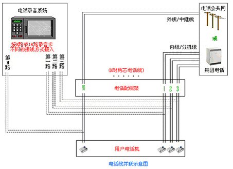 普通電腦或工控機(P233/32M/6.4G以上)。   1. 電話線并聯(lián)方式:(在配線架上將電話線路一分為二,一路到電話機,一路到錄音卡)
