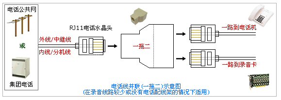 2. 電話線并聯(lián)方式:(采用一拖二將電話線路一分為二,一路到電話機,一路到錄音卡)