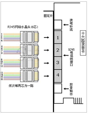 4.16路錄音卡接線方式:(每個RJ45水晶頭,依次每兩芯為一路)