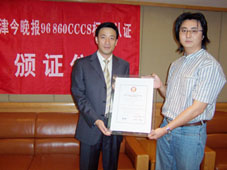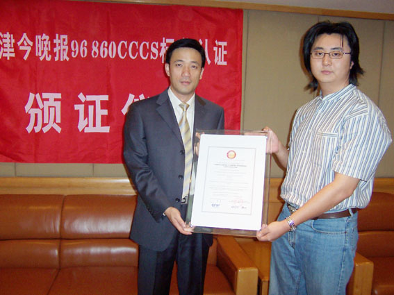 2004年9月9日,天津今晚報公眾服務中心通過了《全國呼叫中心運營績效標準》(CCCS-OP-2003)認證,并獲得由中國信息化推進聯(lián)盟客戶關系管理專業(yè)委員會頒發(fā)的認證證書(四星級客戶服務中心),成為國內(nèi)傳媒業(yè)首家通過此認證的呼叫中心。