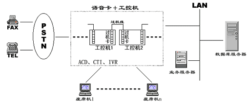 在一些小型CALL CENTER系統(tǒng)中,人們通常通過語音板卡加工控機的方式搭建系統(tǒng),通常一臺設(shè)備就集成了ACD、IVR、CTI等各種資源,各資源的使用、調(diào)派通過軟件進(jìn)行控制,有效的解決了建設(shè)成本高、系統(tǒng)構(gòu)造繁復(fù)的問題,具有相當(dāng)?shù)撵`活性。然而由于工控機和語音板卡容量有限,同時其標(biāo)準(zhǔn)最多只能是工業(yè)級標(biāo)準(zhǔn),因此在構(gòu)建相對大型的呼叫中心時就總是捉襟見肘。為了增加系統(tǒng)容量,解決多臺PC之間進(jìn)行通道交換的難題,人們又設(shè)計了過機卡和過機線來解決,其應(yīng)用系統(tǒng)如下圖:
