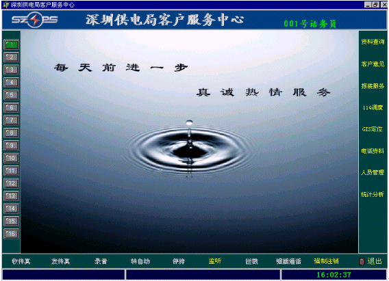 在座席的主畫面的右邊是業(yè)務功能選擇區(qū),是根據(jù)用戶實際工作的具體要求開發(fā)的。(隨后詳細介紹供電行業(yè)的業(yè)務功能模塊)