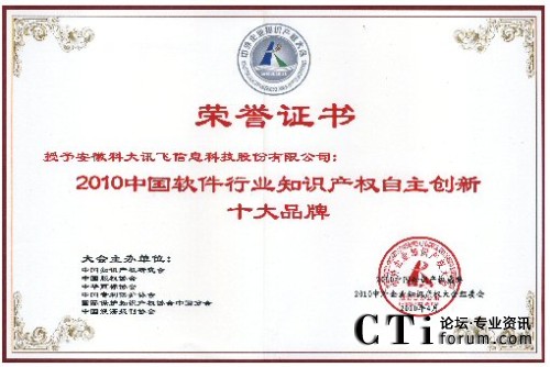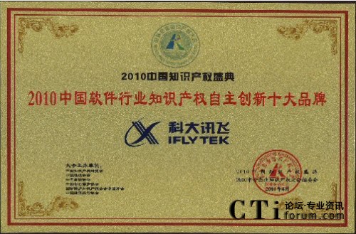 CTI論壇(ctiforum)4月29日消息(記者 潘婷婷):2010年4月25日,由中國知識產(chǎn)權(quán)研究會、中國專利保護(hù)協(xié)會、中國版權(quán)協(xié)會等單位聯(lián)合舉辦的“2010中外企業(yè)知識產(chǎn)權(quán)大會”在人民大會堂隆重舉行。在當(dāng)日的“2010中國知識產(chǎn)權(quán)盛典頒獎典禮”中,科大訊飛憑借強大的自主創(chuàng)新能力以及在知識產(chǎn)權(quán)創(chuàng)造、保護(hù)與應(yīng)用方面的突出表現(xiàn)獲評“2010年中國軟件行業(yè)知識產(chǎn)權(quán)自主創(chuàng)新十大品牌”。