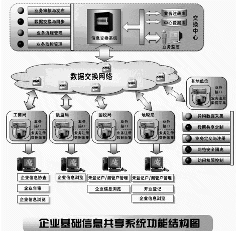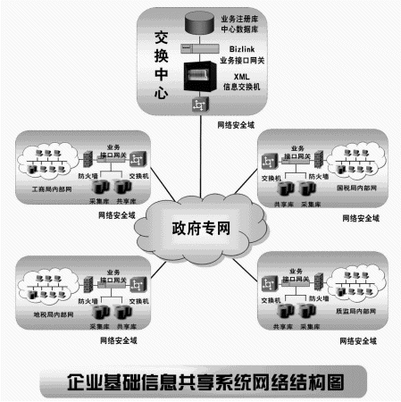 (1) 通過(guò)企業(yè)基礎(chǔ)信息交換與共享系統(tǒng)將不同的政府部門辦公網(wǎng)絡(luò)連接在一起,形成資源共享,消除孤島現(xiàn)象;