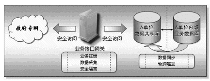 業(yè)務(wù)接入網(wǎng)關(guān)放置在每一個(gè)接入到本系統(tǒng)的部門或單位內(nèi),具有快速方便的異構(gòu)數(shù)據(jù)庫(kù)的連接能力,它主要完成兩個(gè)方面的功能,一方面實(shí)現(xiàn)本部門共享信息的對(duì)外發(fā)布,另一方面也通過(guò)核心的信息交換機(jī)實(shí)現(xiàn)其它相關(guān)部門的共享信息的采集工作。業(yè)務(wù)接口網(wǎng)關(guān)具有兩個(gè)網(wǎng)絡(luò)接口,一端連接本單位的內(nèi)部網(wǎng)絡(luò),另一端接入政府專網(wǎng)中。