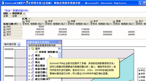 可以利用SynleadCRM企業(yè)版提供的在線聯(lián)機(jī)分析工具實(shí)現(xiàn),也可以導(dǎo)出到EXCEL中,利用EXCEL的有關(guān)功能實(shí)現(xiàn)。OLAP在線聯(lián)機(jī)分析,屬于商業(yè)智能BI的組成部分之一,它允許您對(duì)數(shù)據(jù)進(jìn)行任意的上鉆、下鉆,旋轉(zhuǎn)、切片、切塊,得到更豐富的、更有價(jià)值的圖表和報(bào)表。