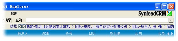 值得欣喜的是,部分CRM廠商意識(shí)到用戶迷路問(wèn)題的嚴(yán)重性,并清楚IE瀏覽器具備的頁(yè)面歷史尋址(History Location)功能滿足不了頁(yè)面內(nèi)數(shù)據(jù)庫(kù)復(fù)雜、動(dòng)態(tài)歷史條件的記憶,必須另外打造屬于CRM應(yīng)用程序自身的歷史堆棧。少許CRM軟件開(kāi)始提供歷史“后退”、“前進(jìn)”按鈕,SynleadCRM歷史精確度保持領(lǐng)先地位。