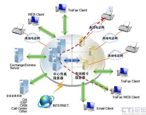 Server板卡服務器都將通過Internet或企業(yè)網絡而相互連接起來,協(xié)同工作, 共同分擔工作負荷, 共享資源和傳真信道。這樣傳真也是被傳遞到離目的地最近的板卡服務器后才發(fā)送出去,從而將國際,國內傳真費用減少為本地傳真費用。