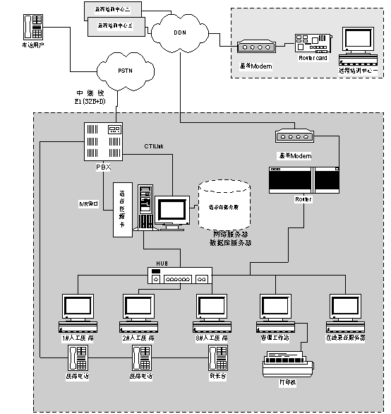 北京強(qiáng)訊恒通網(wǎng)絡(luò)技術(shù)公司通過利用該學(xué)院現(xiàn)有的計(jì)算機(jī)局域網(wǎng),根據(jù)該學(xué)院業(yè)務(wù)需求專門為800服務(wù)熱線設(shè)立了一組服務(wù)座席,每個(gè)座席都有座席電腦。所有撥打800熱線的電話通過CTI服務(wù)器的ACD系統(tǒng)分配到服務(wù)組最適合的座席。如該服務(wù)組暫時(shí)沒有空閑座席,則語音提示用戶等待并播放音樂,一旦有座席空閑則自動(dòng)將該用戶電話轉(zhuǎn)接到空閑座席。當(dāng)有外線進(jìn)來接通到某個(gè)座席時(shí),系統(tǒng)自動(dòng)彈出該電話用戶的客戶資料。