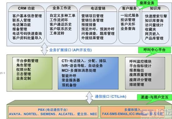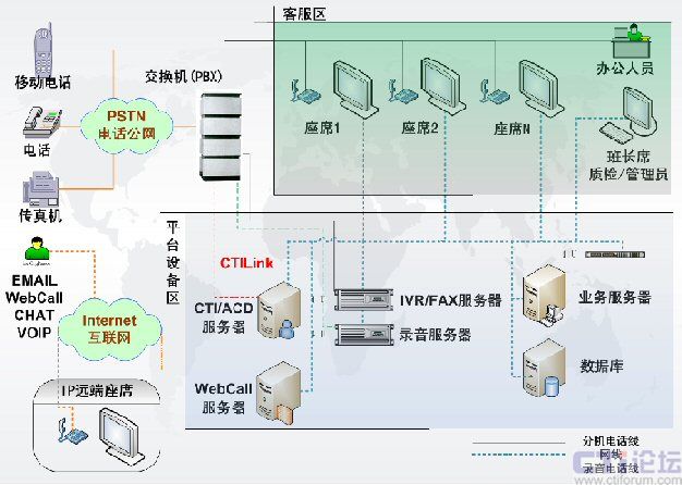 呼叫中心通信平臺(tái),包含了交換機(jī)(PBX)、CTI服務(wù)器、IVR服務(wù)器、傳真服務(wù)器、全程錄音設(shè)備等幾個(gè)部分,是客服中心實(shí)施的基礎(chǔ)。