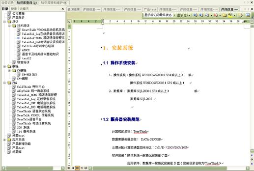 業(yè)務(wù)知識庫系統(tǒng)包括大量的信息,它可以幫助坐席人員精確、及時地得到相關(guān)知識的詳細信息。坐席人員可以利用業(yè)務(wù)知識庫系統(tǒng)提供的多種查詢手段,進行各種信息的查詢。管理人員還可以通過知識庫訪問量統(tǒng)計來了解座席員訪問知識庫的情況,并且可以通過知識庫資料維護來靈活定制知識庫的內(nèi)容。