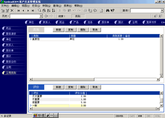為了更靈活、更專業(yè)地管理CRM中的數(shù)據(jù),SynleadCRM專門設(shè)立了一個(gè)"類別"主欄目。在該主欄目下設(shè)立了一個(gè)可以自定義的"公用類別"子欄目。這種機(jī)制的好處在于,類別的建立可以依據(jù)用戶企業(yè)個(gè)性化的需求,隨時(shí)靈活調(diào)整,具有"可生長(zhǎng)性"。CRM行業(yè)公認(rèn)的領(lǐng)導(dǎo)者Siebel CRM采用的就是這樣的機(jī)制。如若不然,操作者就不得不無(wú)休止地增加記錄的字段值。后一種方式"可生長(zhǎng)性"不強(qiáng),而且有可能涉及到更改數(shù)據(jù)庫(kù)結(jié)構(gòu),影響CRM系統(tǒng)的穩(wěn)定性。