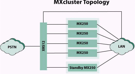 為支持冗余配置蘇迪思科技公司同時推出新產(chǎn)品XRS12物理連接轉(zhuǎn)換開關。XRS12可被安裝在19英吋的機架上,并將占用機架中的1RU單元。MXcluster集群中每一臺MX250上的PSTN線路均通過XRS12連接至PSTN網(wǎng)絡。當某一臺MX250出現(xiàn)故障時,XRS12自動將與該臺MX250對應的PSTN網(wǎng)絡線路轉(zhuǎn)接至備份MX250上。使用XRS12,無需管理員介入操作,即可實現(xiàn)MXcluster集群與PSTN的不間斷連接。