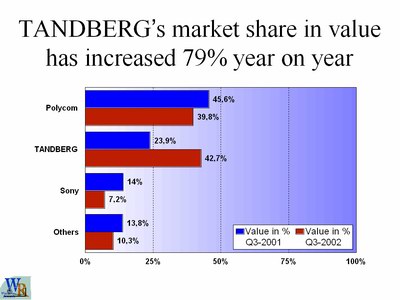 (1)   產地挪威,該品牌為視頻會議業(yè)界的高端產品。該品牌全系列均屬第三代產品,具有多項視頻會議的首創(chuàng)技術,最高功耗只有65W,最高帶寬3M,是美國國防部、加拿大國防部、聯(lián)合國教科文組織、歐洲多個國家王室及大型跨國集團選用的品牌,F(xiàn)在全球市場占有量第一位(依據2002年第3季度資料)。