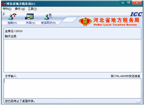 9. 掛斷:如果坐席想中止和此納稅人的通信(文本交談和遠(yuǎn)程共享),坐席可以點擊掛斷按鈕。掛斷后左下角狀態(tài)欄提示“您已經(jīng)中斷本次通話”。如下圖: