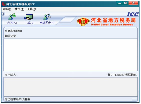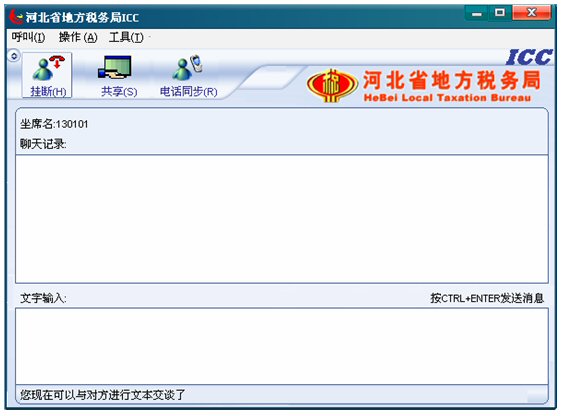 5. 點擊應(yīng)答按鈕后,應(yīng)答按鈕變?yōu)閽鞌喟粹o,并且左下角的狀態(tài)欄文字提示首先變?yōu)椤澳F(xiàn)在可以與對方進(jìn)行文本交談了”,從現(xiàn)在開始到坐席掛斷呼叫期間,坐席就可以和納稅人進(jìn)行文本交談了。