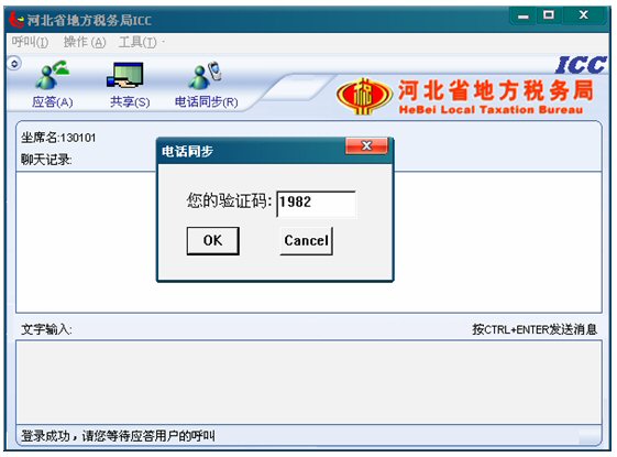 坐席只需通過電話將此框中的驗證碼(比如圖例中的1982驗證碼)告訴和坐席通話的納稅人。然后點擊OK按鈕。納稅人端得到坐席告訴他的驗證碼后,納稅人端也有個電話同步按鈕,納稅人點擊并輸入坐席告訴他的驗證碼后,坐席就可以看到有呼叫進(jìn)來。此呼叫就是正和坐席通話納稅人的ICC呼叫。坐席點擊應(yīng)答后就可以和此納稅人ICC