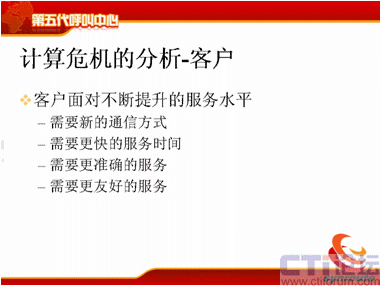 我分析一下計算的危機,計算危機來源于三個方面,第一是客戶面對不斷提升的服務水平,現(xiàn)在需要新的通信方式,包括電話、傳真、短信、電子郵件等等,還包括網(wǎng)上的護航瀏覽,表單共享,電子排版等等通信方式。第二方面需要更快的服務時間,80%的電話是20秒接起,可是短信的響應時間為什么這么長,需要更準確的服務,電話的服務是什么樣的,我現(xiàn)在需要網(wǎng)上交談的服務質(zhì)量也能夠得到保障等等,這是客戶對IT服務者提供的壓力。