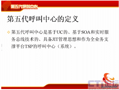 第五代呼叫中心的定義比較簡單,第五代呼叫中心是基于UC的,基于SOA和實時服務總線技術(shù)的,具備JIT管理思想和作為全業(yè)務支撐平臺TSP的呼叫中心系統(tǒng)。