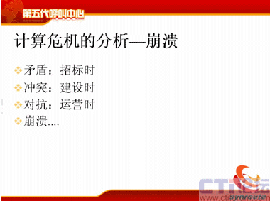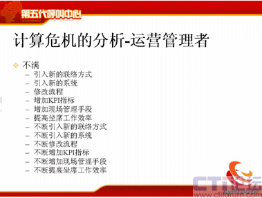 計算危機的下一方面是運營管理者,可能在座很多人是做運營管理的,你們會不斷去跟IT服務者提需求,我下一個月想引進新的聯(lián)絡方式,下個月我想引進新的軟件,引進新的流程,我想增加KPI指標,我想增加現(xiàn)場的管理手段,我想提高座席的工作效率,后面也是不斷的,不斷地去引入新的聯(lián)絡方式。