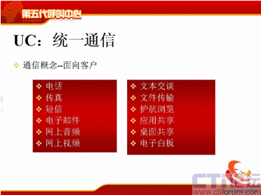 那么這幾個特點稍微簡單地說一下,可能大家了解比較多了,從UC上來講,不管是現(xiàn)在國際上比較領先的通信廠商,CISCO、華為都在提UC的概念,軟件行業(yè)包括微軟。UC包括了通信的渠道,包括電話、傳真、短信、電子郵件、網(wǎng)上音頻、視頻,文本交談,文件傳輸、護航瀏覽、應用共享、桌面共享等等,這是統(tǒng)一通信的部分。