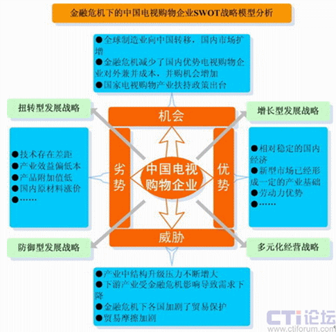 1992年至2009年以來,電視購物經(jīng)歷了從割據(jù)到統(tǒng)一,全國購物頻道網(wǎng)絡(luò)化;從粗放到科學(xué),頻道運(yùn)營模式專業(yè)化;從簡介到深度,頻道編排方式規(guī)律化、從滯后到及時(shí),物流配送體系成熟化。電視購物被譽(yù)為繼零售、超市之后的第三次銷售革命,電視購物將成為金融危機(jī)經(jīng)濟(jì)形態(tài)下未來中國電視新的經(jīng)濟(jì)增長點(diǎn),而付費(fèi)電視、數(shù)字網(wǎng)絡(luò)電視的發(fā)展,是中國電視購物市場新的戰(zhàn)略機(jī)會。金融危機(jī)下的中國電視購物企業(yè)SWOT戰(zhàn)略模型分析如下: