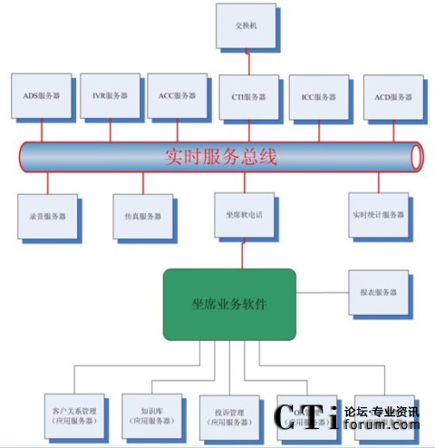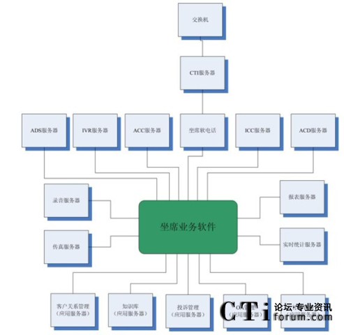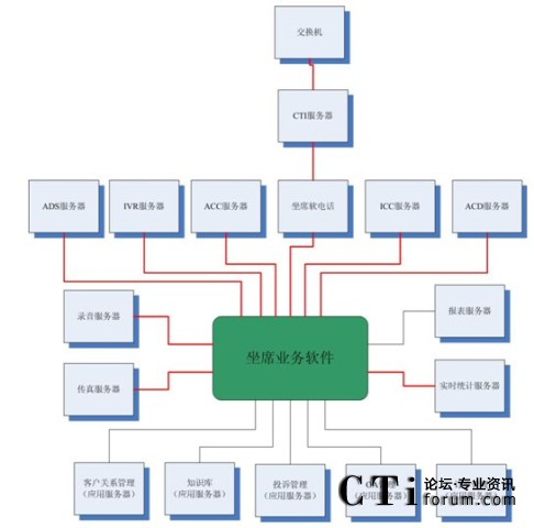 很多集成商或業(yè)務(wù)軟件開(kāi)發(fā)商認(rèn)為這種結(jié)構(gòu)過(guò)于復(fù)雜,而他們自身往往提供“整體解決方案”,即所有的服務(wù)器軟件基本上都是自己的,根據(jù)客戶的要求修改即可。例如,客戶關(guān)系管理、知識(shí)庫(kù)、投訴管理、OA、訂單管理以及坐席軟電話、ADS服務(wù)器、IVR服務(wù)器、ACC服務(wù)器、ICC服務(wù)器、ACD服務(wù)器、錄音服務(wù)器、傳真服務(wù)器、報(bào)表服務(wù)器、實(shí)時(shí)統(tǒng)計(jì)服務(wù)器都是自己來(lái)做,那么對(duì)于很多接口環(huán)節(jié)都可以節(jié)省了。