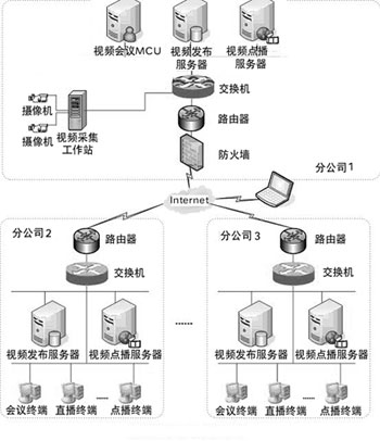 旺城國際控股集團(tuán)視頻會(huì)議系統(tǒng),其Internet出口帶寬為10M,因?yàn)樵摮隹谶要傳輸各種業(yè)務(wù)數(shù)據(jù),所以實(shí)際用于視頻會(huì)議的帶寬大概在5M左右,各分公司的接入速率在384Kbps~768Kbps之間。方案采用一臺高性能服務(wù)器作為MCU,以確保支持五會(huì)場的遠(yuǎn)程接入。同時(shí),在五個(gè)分公司配置一臺直播服務(wù)器,支持各地Intranet(均為100M帶寬)內(nèi)的電腦用戶接收會(huì)議現(xiàn)場組播,并錄制、上傳到點(diǎn)播服務(wù)器備份以供會(huì)后研討。整個(gè)視頻會(huì)議的包括: