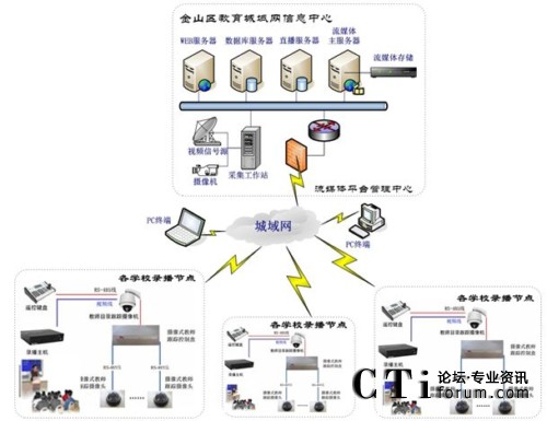 流媒體平臺采用分布式架構(gòu)部署,分為web服務(wù)器,數(shù)據(jù)庫服務(wù)器、直播服務(wù)器和流服務(wù)器,如有必要可在信息中心架設(shè)采集工作站搭建網(wǎng)絡(luò)電視或?qū)崨r直播應(yīng)用,在各個學(xué)校已經(jīng)部署錄播系統(tǒng)或直播系統(tǒng)的教室配置流媒體功能組件,這樣錄播實(shí)況可以實(shí)時(shí)傳送到流媒體平臺管理中心的全局直播服務(wù)器上,同時(shí)錄播的學(xué)校本色課件也可以上傳存儲到金山區(qū)教育局信息中心的流存儲服務(wù)器上,方便今后的檢索、點(diǎn)播、評估等各種應(yīng)用。