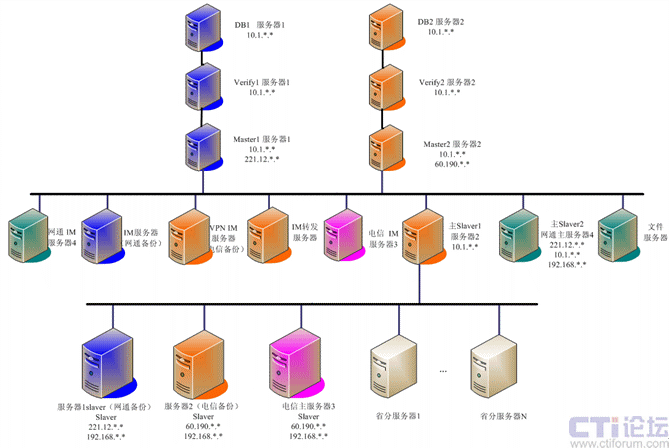 系統(tǒng)基礎(chǔ)平臺的部署采用4臺物理服務(wù)器方式實現(xiàn),四臺物理服務(wù)器分別有多塊網(wǎng)卡,為不同網(wǎng)絡(luò)用戶提供不同服務(wù),同時實現(xiàn)實現(xiàn)核心數(shù)據(jù)的冗余、備份。在二級機構(gòu),即在省級每個省部署一臺分服務(wù)器,實現(xiàn)當?shù)赜脩舻臄?shù)據(jù)轉(zhuǎn)發(fā)等任務(wù),系統(tǒng)部署入下圖所示: