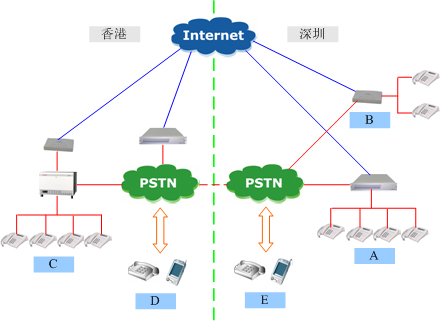 A點(diǎn)是深圳福田的office,B點(diǎn)是深圳蛇口的辦事處,C點(diǎn)是香港總部的office,D點(diǎn)香港本地電話和國際長途,E點(diǎn)是深圳本地的電話用戶和國際長途。