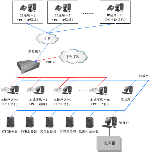 RT-CCP1000還有100M以太網(wǎng)接口,通過(guò)這個(gè)接口可以把RT-CCP1000連接到Internet上。每個(gè)IP座席配備VOIP終端(IP電話、軟電話或IAD)和電腦各一臺(tái),VOIP終端把Proxy地址指向RT-CCP1000,電腦上安裝座席客戶端軟件,都通過(guò)Internet接入中心系統(tǒng)。
