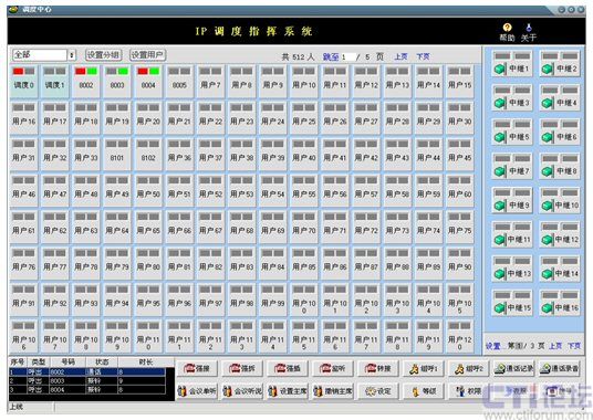 在此界面中實現(xiàn)了配置管理功能和呼叫相關(guān)功能。配置管理分為:設(shè)置、修改和刪除分組,設(shè)置用戶,設(shè)置中繼,翻頁等功能;呼叫相關(guān)功能:強(qiáng)接、強(qiáng)拆、強(qiáng)插、監(jiān)聽、轉(zhuǎn)接、組呼、設(shè)定等級、設(shè)定權(quán)限、設(shè)定夜服、會議相關(guān)等功能。另外,可以在本軟調(diào)度系統(tǒng)中檢索瀏覽相關(guān)通話記錄,并可對錄音進(jìn)行回放。