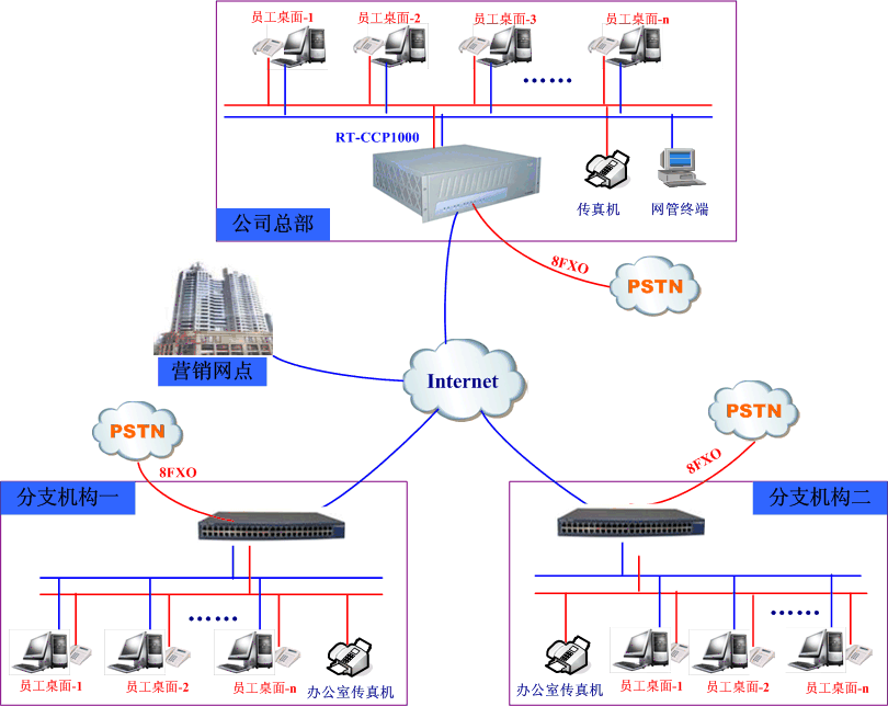 生產(chǎn)總部與分支機(jī)構(gòu)、營銷網(wǎng)點實現(xiàn)統(tǒng)一辦公電話功能(即VOIP組網(wǎng)+辦公電話功能)。