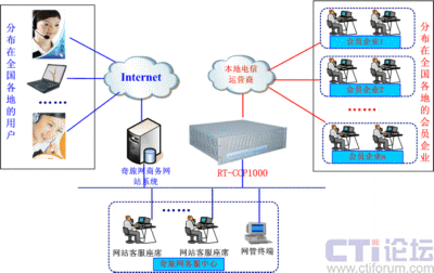 融天科技采用自主研發(fā)的融合通信平臺RT-CCP1000設(shè)備一套為奇旅網(wǎng)部署了一套Web-call聯(lián)絡(luò)中心。RT-CCP1000集傳統(tǒng)PBX、IP-PBX、CTI、IVR、DB、VOIP、錄音、傳真等服務(wù)于一體,以模塊化的形式提供用戶所需的各種功能,是一套功能強(qiáng)大的一體化融合通信平臺,安裝部署非常方便,維護(hù)管理非常簡單。該方案中,與本地電信運(yùn)營商采用數(shù)字中繼E1接口和模擬中繼FXO接口方式連接,軟電話以控件方式嵌入到奇旅網(wǎng)公司的商務(wù)網(wǎng)站上, RT-CCP1000將接收所有以該控件方式來至Internet來的呼叫,并通過與電信運(yùn)營商接口呼叫相關(guān)會員企業(yè)綁定的聯(lián)絡(luò)電話,這樣就實(shí)現(xiàn)了上網(wǎng)用戶通過電腦與會員企業(yè)免費(fèi)進(jìn)行直接聯(lián)絡(luò)。網(wǎng)絡(luò)拓?fù)鋱D如下: