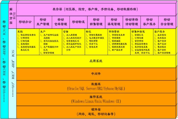 隨著移動商務時代的到來,電子商務時代的企業(yè)信息化系統(tǒng)(或者企業(yè)管理系統(tǒng)),包括SCM(供應鏈管理)、ERP(企業(yè)資源規(guī)劃)、CRM(客戶關(guān)系管理)、OA(辦公自動化)和財務系統(tǒng)等等將逐漸向Mobile-SCM(移動供應鏈管理)、Mobile-ERP(移動企業(yè)資源規(guī)劃)、Mobile-CRM(移動客戶關(guān)系管理)、Mobile-OA(移動辦公)等演變,并隨著應用的逐漸普及,給企業(yè)的生產(chǎn)經(jīng)營流程帶來巨大而深刻的變化。