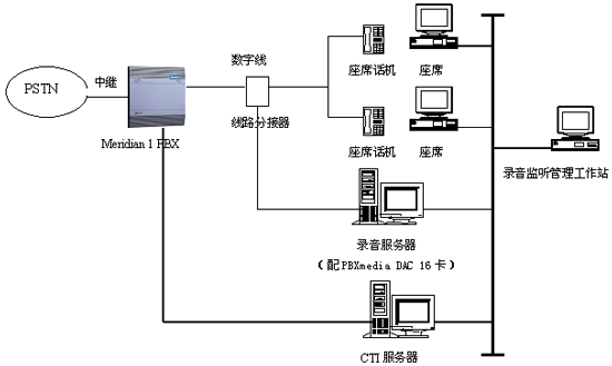使用Music Telecom PBXmedia DAC 16線數(shù)字PBX錄音監(jiān)聽接口卡,直接與北電Meridian 1交換機(jī)的數(shù)字用戶線的分接線連接,實(shí)現(xiàn)并線錄音。其物理結(jié)構(gòu)如下所示: