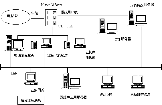主要包括:Siemens Hicom 318com交換機、CTI服務(wù)器、IVR/FAX服務(wù)器、業(yè)務(wù)代表座席、班長和質(zhì)檢座席、電話錄音監(jiān)聽系統(tǒng)、數(shù)據(jù)庫應(yīng)用服務(wù)器、統(tǒng)計分析工作站、系統(tǒng)維護管理工作站、業(yè)務(wù)網(wǎng)關(guān)、網(wǎng)絡(luò)系統(tǒng),其邏輯結(jié)構(gòu)下圖所示。