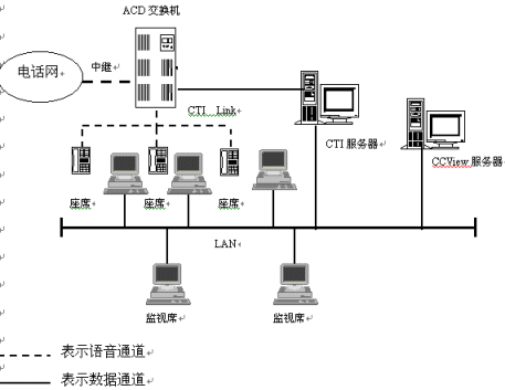 在呼叫中心系統(tǒng)中,ACD交換機(jī)除提供語(yǔ)音接入外,還提供高效的ACD(自動(dòng)來(lái)話(huà)分配)功能,在本系統(tǒng),若需要監(jiān)視座席話(huà)機(jī)的狀態(tài),還必須提供計(jì)算機(jī)電話(huà)集成CTI功能。